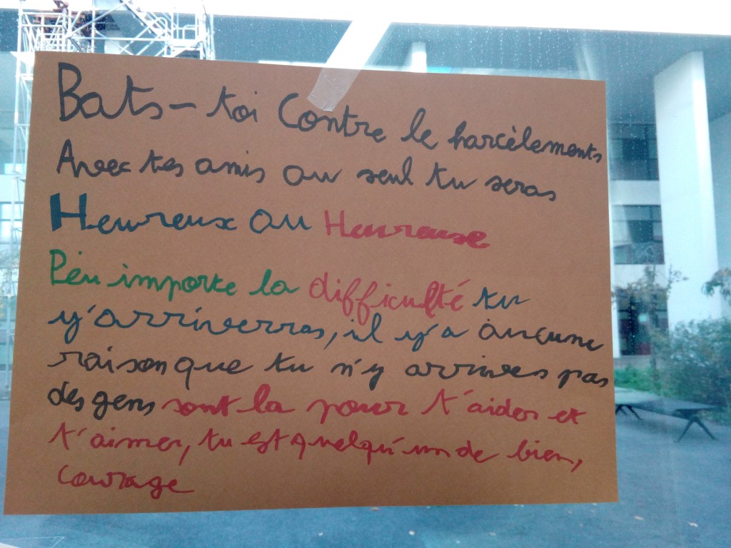 Ainsi, lors de cette journée très spéciale, on pouvait lire sur les portes, poteaux, murs et vitre de l’établissement des nombreux messages dédiés à la cause. A ne pas oublier le numéro vert 3020 qui est un numéro à appeler en cas de harcèlement scolaire pour pouvoir vider son sac et être écouté de manière anonyme.